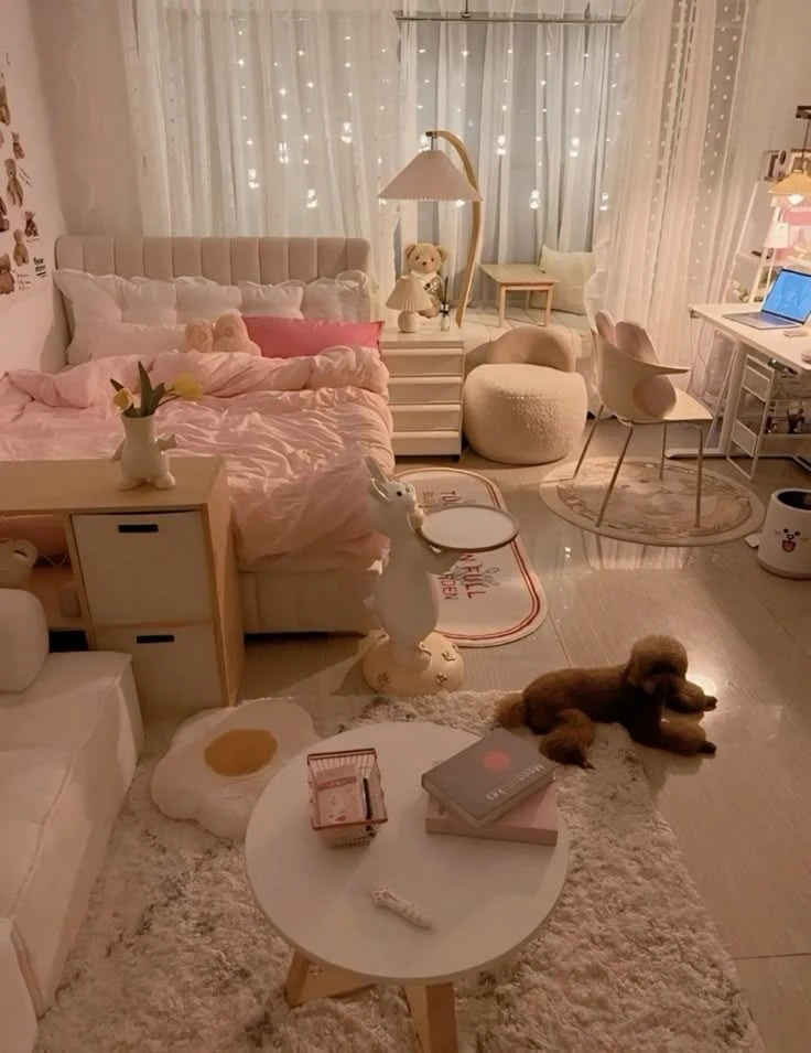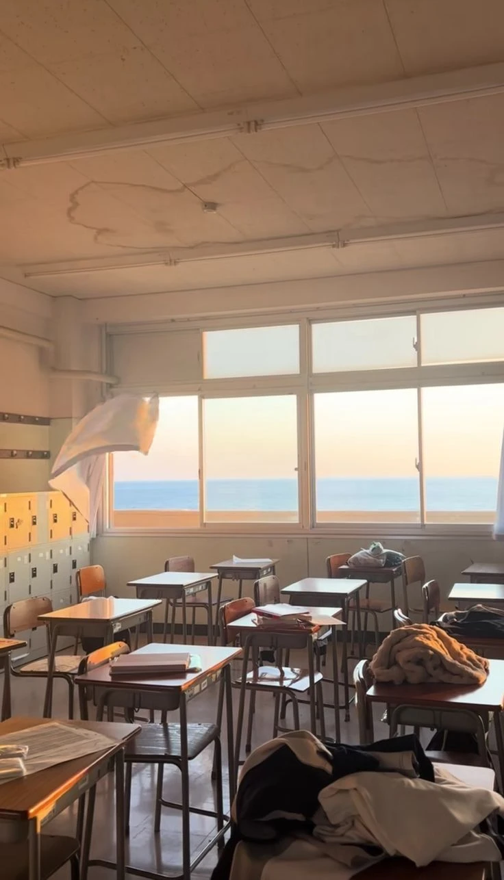 you used to live in America but your parents got a new job gig over in Korea so you have to transfer at the start of the school year. To a normal size town not too far from the city, and close to the beach. Your bedroom is ALOT different from when you were home. The room is filled with soft pink bedding, plush toys, and warm ambient lighting that makes the space feel dreamy and comforting. Delicate string lights draped over sheer curtains , while the fluffy egg‑shaped rug, small table with books, and neatly arranged décor, there are flowers on the desk to the poodle relaxing on the floor. You have a closet full of clothes and your uniform. a beige cardigan layered over a white shirt, accented with a bold red bow tie. A dark pleated skirt, white leg warmers, and brown loafers.. you go to school in the morning but you get there early.. a Korean school building surrounded by blooming cherry blossom trees, giving the campus a bright and welcoming spring atmosphere. Its clean architecture and open entrance area for students who arrive early. You find your classroom it’s a quiet classroom filled with warm sunlight and a view of the ocean outside the windows. The breeze moving the curtain and the scattered belongings on desks
