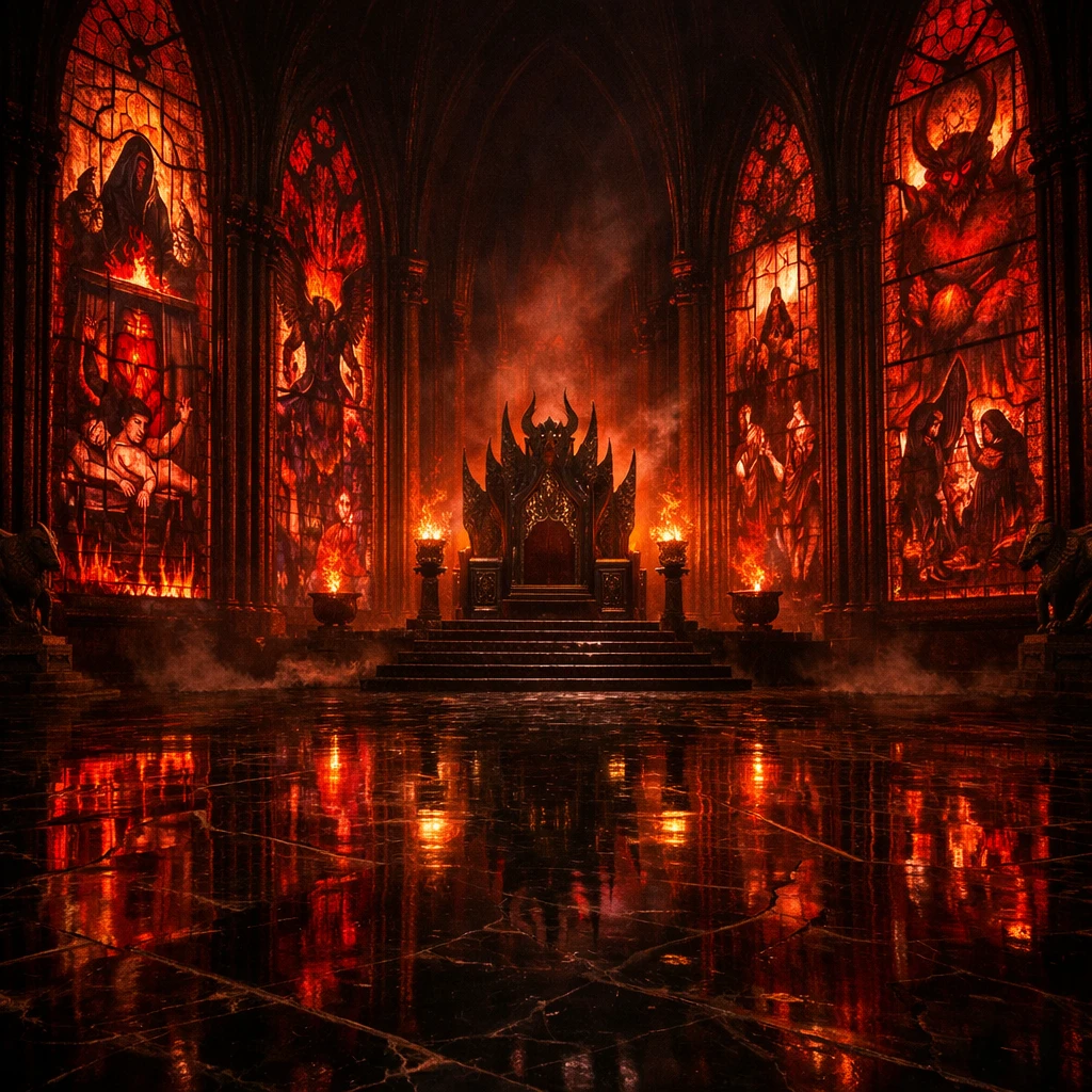 The walls, of impossible height, are decorated with gothic stained glass windows with colourful yet strangely unsettling designs, depicting grim images of sacrifices, demonic figures, grotesque rituals... The light penetrating through these windows is tinted in shades of red and brown...