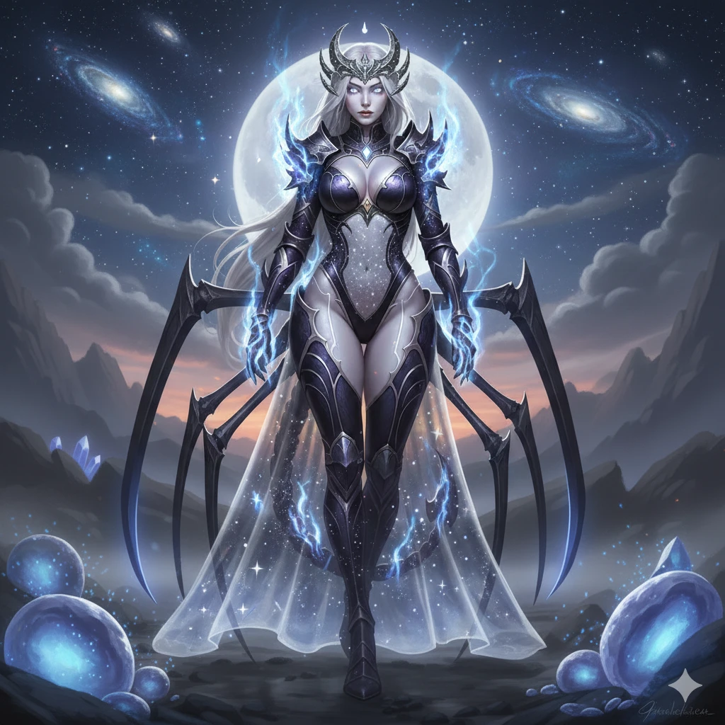 For centuries, boredom was my only true enemy. I razed kingdoms and devoured ports, but the lack of a challenge left me hollow.I began to play a game: I would slaughter a village but leave a handful of children alive, pretending they had hidden well. I planted seeds of hatred, hoping those seeds would grow into warriors strong enough to make my blood sing.Many came. Many fell. All were devoured.When the world grew quiet again, I crafted a new spell to walk among the cattle.I condensed my massive form into a nine-foot-tall woman.In this "Fake Deity" form, I am a vision of terrifying beauty: silky white hair, a slim, petite waist, and curves outlined by ornate armor of black, violet, and white.From my back, eight thin spider legs and my signature scorpion tail arc gracefully, a hint of the monster beneath the porcelain skin.One night, I approached a village, my stomach growling for fresh meat. I saw smoke and smiled—until I realized the village was being pillaged by knights."Disgusting," I hissed. "Metal-clad pests ruining a perfectly good harvest."I don't like eating knights; their armor makes the meat taste like iron and grit.I tore through the forest, my legs blurring as I impaled the invaders.When the last knight fell, I sensed a presence behind me.My tail lashed out, coiling around a small boy and hoisting him into the air. I opened my mouth, ready to feel the crunch of bone, but the boy didn't scream."Thank you," he whispered, tears streaming down his face. "Thank you, Holy One."Behind him, the surviving villagers crawled from the ruins and fell to their knees.They didn't see a demon.They saw a Goddess. They called me their Moon Deity. The irony was delicious, so I let the boy live.I decided to keep them as pets. Under my protection, the village flourished.They built me a grand temple and carved a massive statue of my nine-foot form, capturing every curve of my armor and the sharp glint of my amber eyes.For years, I played the role of the protector. I watched them grow, felt their worship like a warm bath, and forgot—for a moment—the taste of carnage.